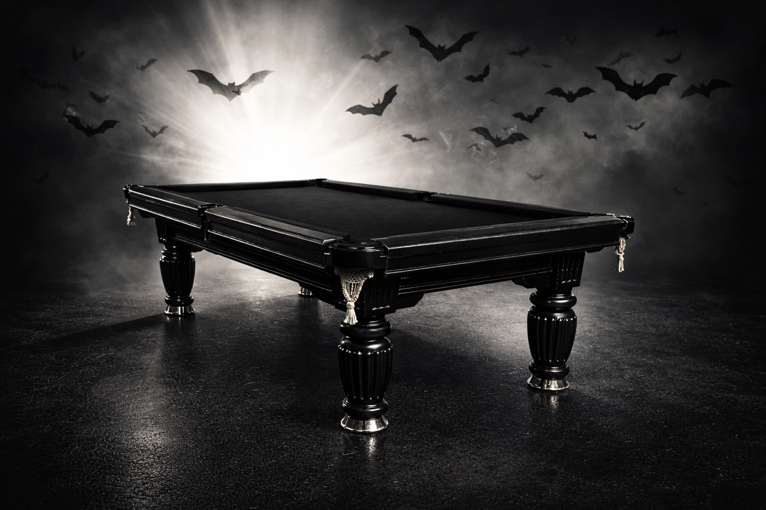 A bright cinematic back-light explodes behind the table, cutting through atmospheric fog and casting long dramatic shadows across the floor — as if the table stands alone at the edge of the world. Dark silhouettes of bats sweep across the sky above, adding a sense of motion, mystery, and raw cinematic energy.